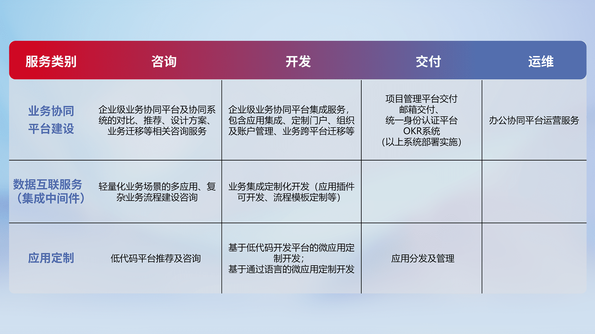 针对钉钉、、、企微、、、IDaas等平台级产品提供产品的规划、、、方案、、、、交付、、、定制化开发等服务,,实现如统一协同办公、、智能客户服务、、、混合会议管理、、、智能数据查询、、等业务场景,,,,实现数字化转型。。。