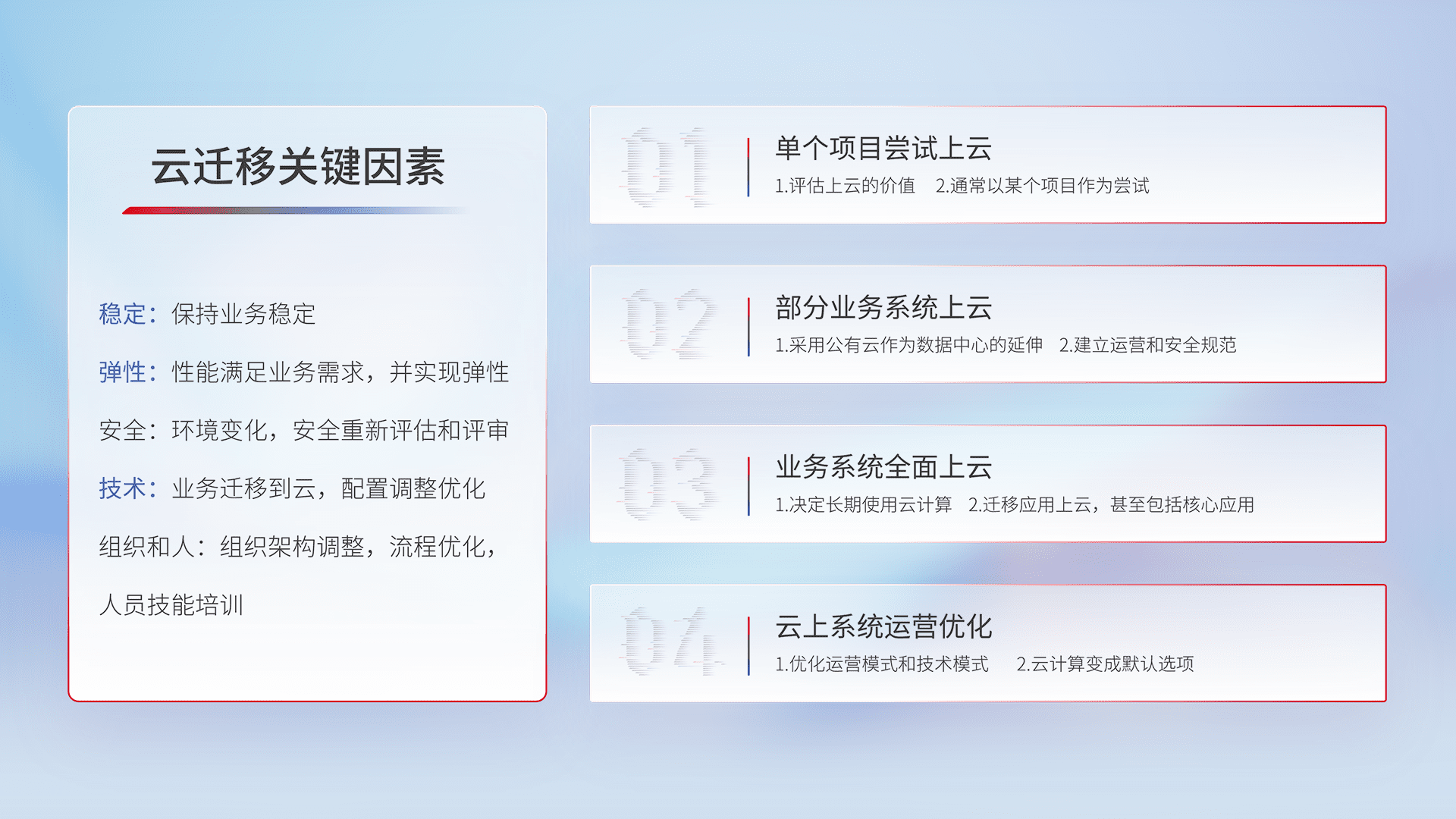 结合实际业务,,,,从规划设计、、云平台选型、、、、云原生改造、、、数据迁移、、、集成交付,,,迁移全过程为客户识别最佳上云路径,,,做好风险识别管理,,,,设计网络架构、、身份权限、、、安全审计合规、、、、操作审计、、日志审计、、监控告警策略、、多站点容灾设计等,,,,对云上基础设施进行整体规划,,,提升IT治理水平,,,以满足弹性、、、高可用、、、高性能的需求。。。。