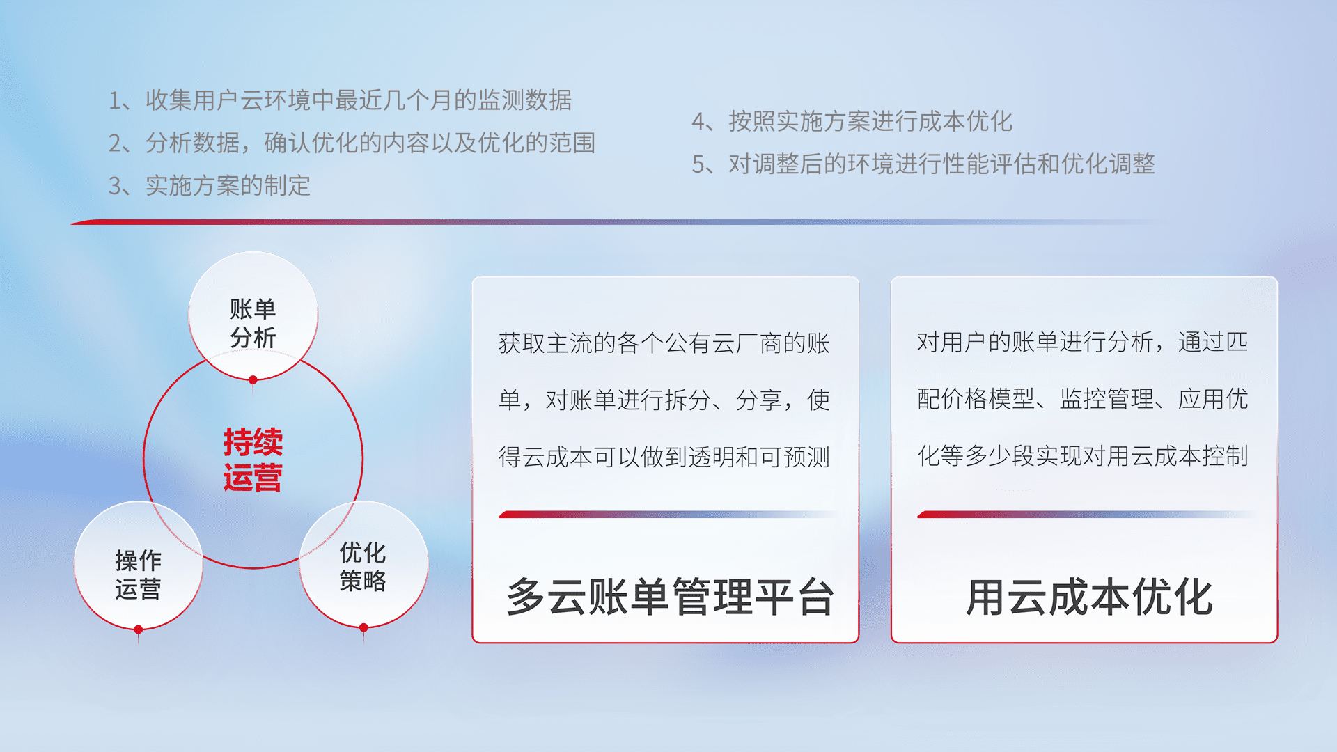 通过多云纳管,,以统一的资源数据模型把客户的云资源进行抽象和封装,,,进而实现对多云资源的统一操作,,,,保障云资源管理的可靠性、、、稳定性与可用性。。。量身定制化运维内容,,,,配置、、、开发运维、、补丁管理、、、备份、、、、监控、、、、认证和访问管理、、、审计和日常巡检等,,保障在用云过程中的可靠度,,,稳定度以及高可用率。。